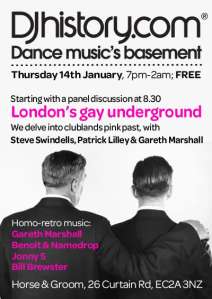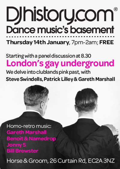 Last year upstairs at The Horse & Groom, Shoreditch I was invited by djhistory.com to contribute (as Marmite Madge) to a discussion panel on Gay Clubland 1960’s – 1980’s with Gareth Marshall, Patrick Lilley & Steve Swindells, compered by Bill Brewster. The room was jam packed with a majority of under 30 indie twinks transfixed by our memories for an hour and a quarter with hardly anyone moving to the bar. The olds were in command.